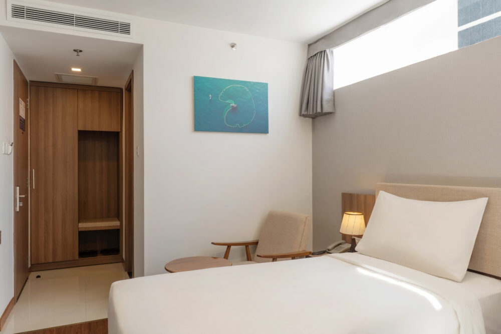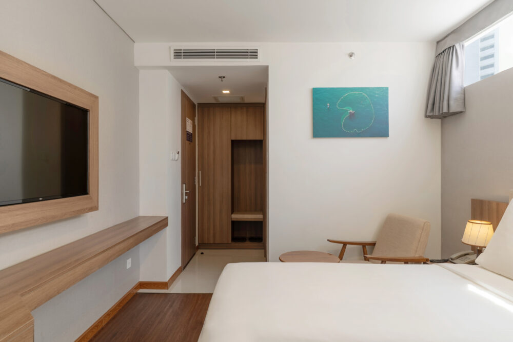 Complete with high-speed Wi-Fi, plush bedding, and a modern standing shower. This room is an ideal choice for friends or small families enjoying a short getaway in Nha Trang.